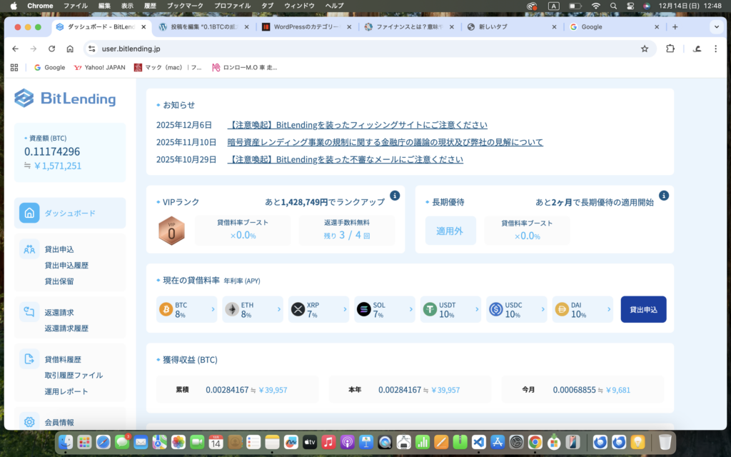 残念ながら現状2025年(今年)の11月の半ばごろから1BTCが1500万円を下回ってしまっているため、0.1BTCを Bit Lendingに預けても月1万円分のBTCはもらえず8000円代〜9000円代程となっています。